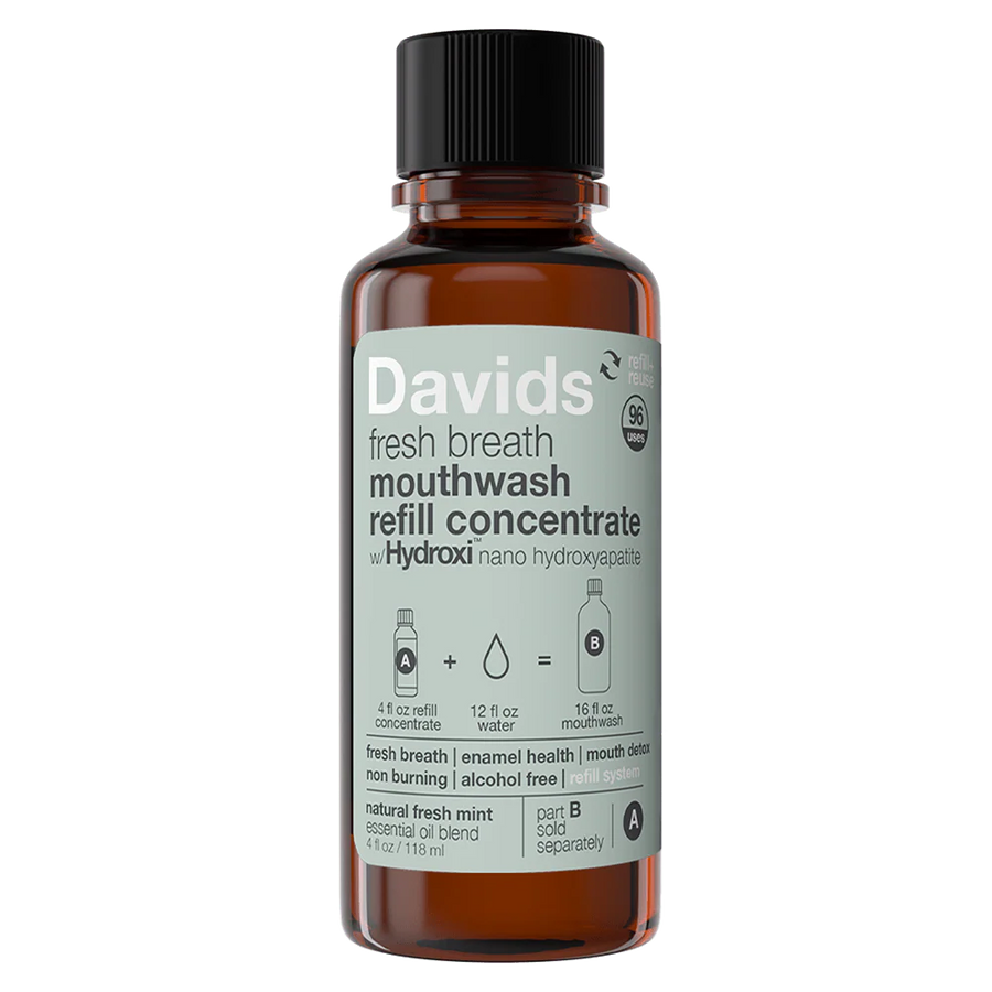 Keep your mouth feeling fresh and your routine waste-free with the Davids Hydroxi™ Mouthwash Refill Concentrate. Designed for use with the Davids 16oz reusable glass bottle (sold separately in the Mouthwash Kit), this 4oz concentrate blends powerful ingredients with a clean, alcohol-free formula.