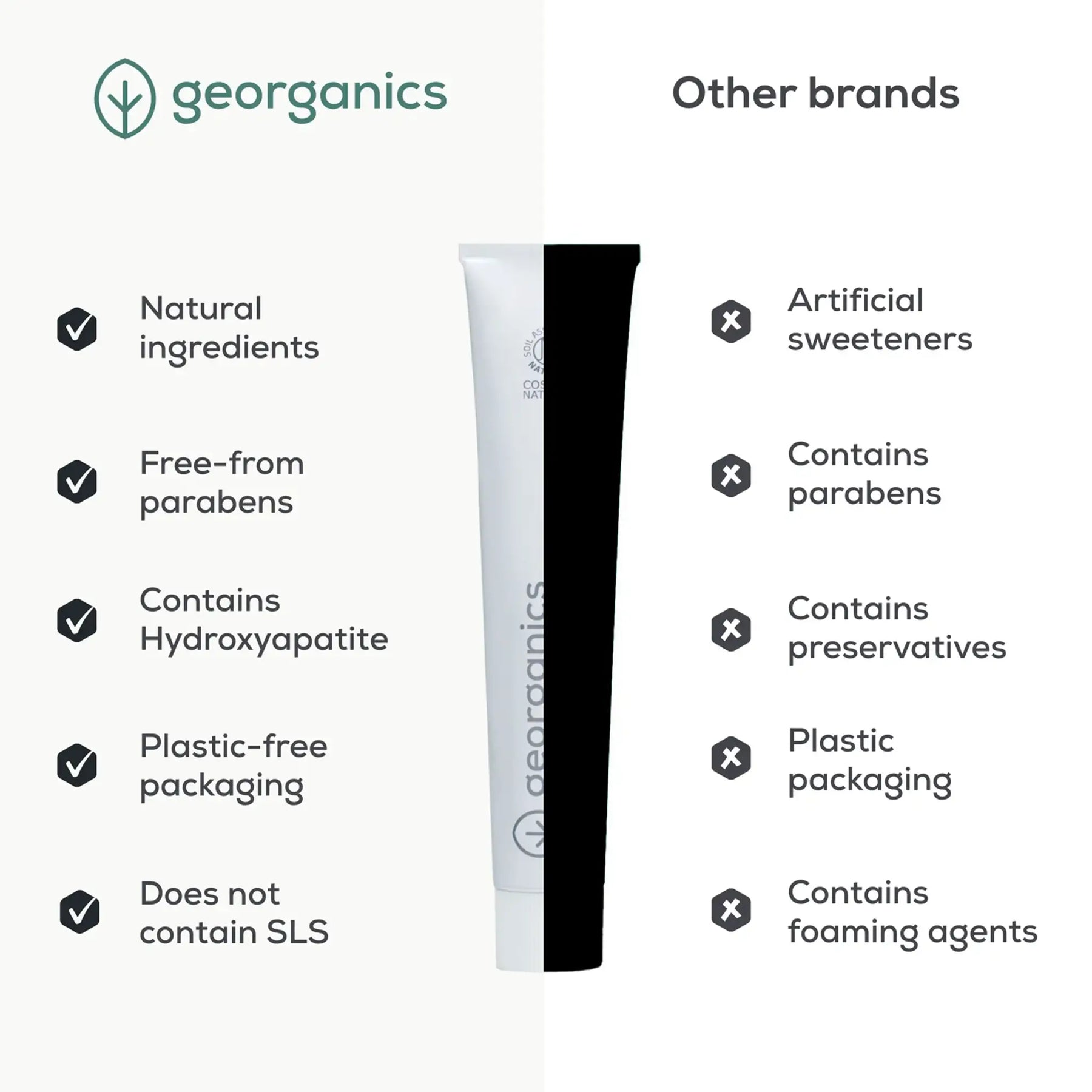 At its core is the same trusted combination of hydroxyapatite, sodium fluoride (1350ppm), and erythritol found across the Georganics range, providing a thorough, effective clean alongside the fluoride protection many people prefer in their daily toothpaste. Activated charcoal and xylitol add to the antiplaque action, helping to keep the mouth feeling genuinely clean long after brushing.